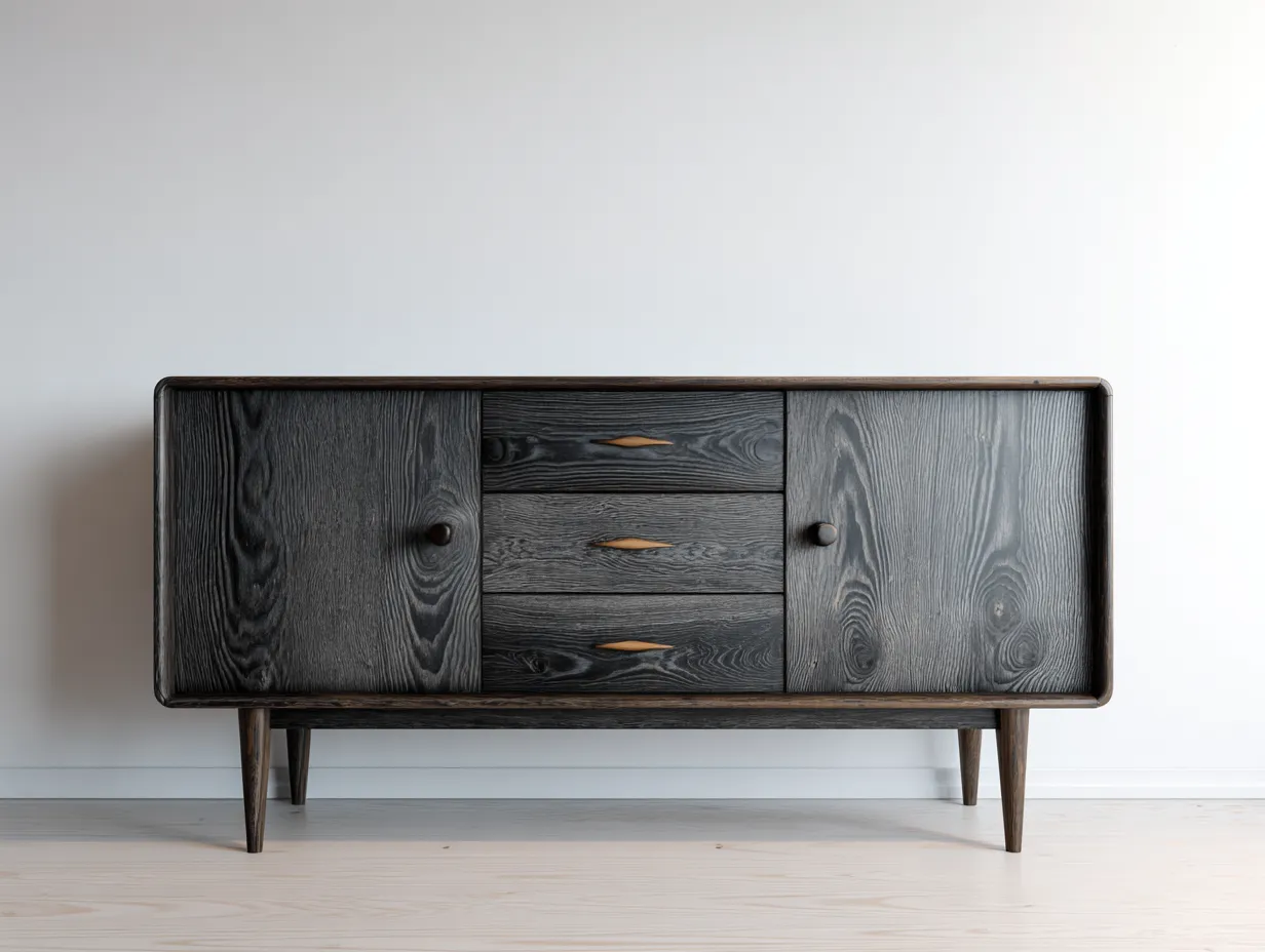 Struttura realizzata in legno massello con finitura nero antracite. La superficie evidenzia la venatura naturale del legno, offrendo una sensazione materica autentica e una buona resistenza all'uso quotidiano.